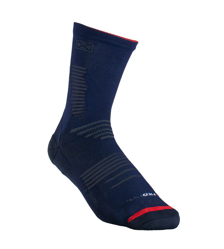 Medias de compresión pensadas para el deportista. Desarrollada para contribuir a la re-circulación del sistema sanguíneo y a la contención de los músculos. Tejida con hilado MEDFYL que posee propiedades antibacterianas y antivirales que combaten el mal olor. Colaboran en la prevención de la fascitis plantar por la compresión transmetatarsal. Puño doble elastizado, caña y pie anatómicos, sectores específicos de ventilación para evitar el calentamiento del pie. Puntos de apoyo sectorizados con mayor densidad para absorber impactos. Talón y puntera reforzados, costura de puntera extra plana. Secado rápido gracias a su composición.