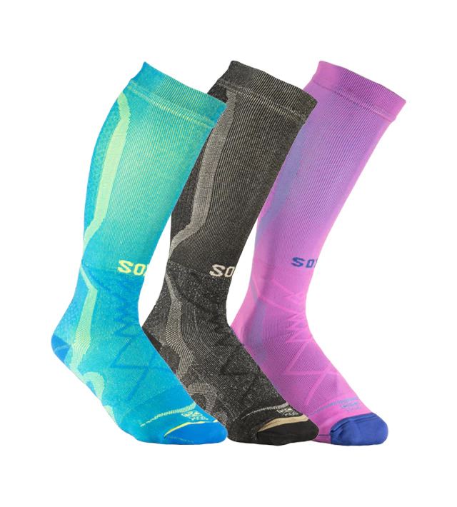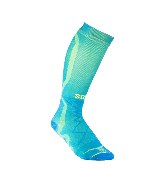 Medias de compresión graduada pensadas para el deportista. Desarrolladas para contribuir a la re-circulación del sistema sanguíneo y a la contención de los músculos. Colaboran en la prevención de la fascitis plantar por la compresión transmetatarsal. El agregado de puntos de contacto permite la relajación de las tensiones propias del pie. Pie con media interna de microfibra incorporada que expulsa la humedad hacia el exterior y reduce el rozamiento del pie con el calzado para evitar la aparición de ampollas. Capa externa de compresión graduada que se extiende desde la punta de los dedos hasta debajo de la rodilla de forma continua. La compresión inicia detrás de los dedos para mayor libertad de los mismos, tal como está indicado el concepto de compresión graduada. Costura de puntera extra plana, talón y puntera reforzados. Puño doble, secado rápido gracias a su composición.