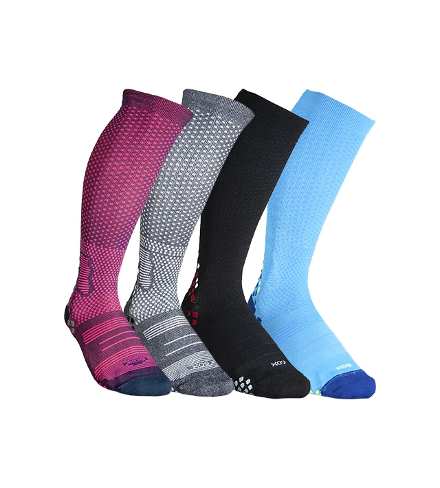 Medias de compresión graduada pensadas para el deportista. Desarrolladas para contribuir a la re-circulación del sistema sanguíneo y a la contención de los músculos. Colaboran en la prevención de la fascitis plantar por la compresión transmetatarsal. Caña con punto de tejido especialmente diseñado para lograr una mejor ventilación de la pierna, caña y pie anatómicos, sectores específicos de ventilación para evitar el calentamiento del pie, puntos de apoyo sectorizados con mayor densidad para absorber impactos. Puño doble, talón y puntera reforzados, costura de puntera extra plana. Secado rápido gracias a su composición.