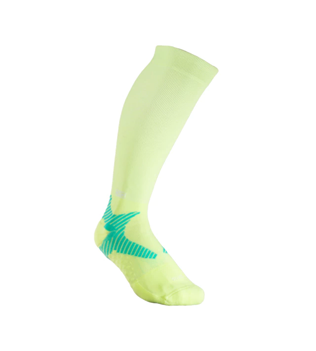 Medias de compresión graduada pensadas para el deportista. Desarrolladas para contribuir a la re-circulación del sistema sanguíneo y a la contención de los músculos. Colaboran en la prevención de la fascitis plantar por la compresión transmetatarsal. El agregado de puntos de contacto permite la relajación de las tensiones propias del pie. Con protector del tendón de Aquiles que reduce la incidencia de los puntos de presión y el riesgo de las lesiones por roce y moretones. Costura de puntera extra plana. Puño doble, talón y puntera reforzados. Secado rápido gracias a su composición.